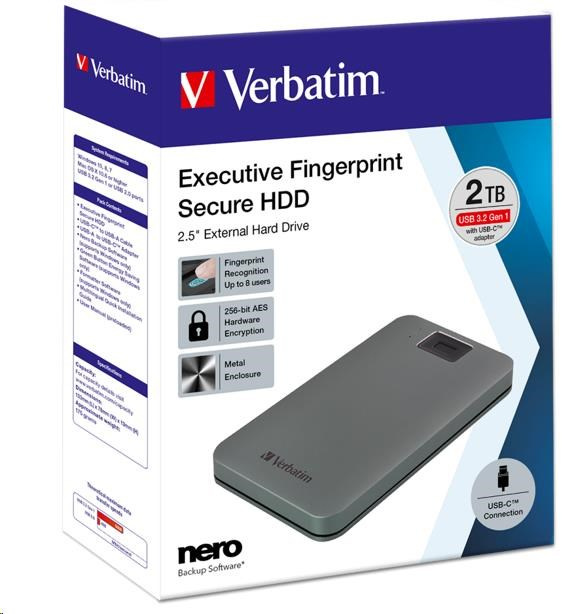 VERBATIM externí HDD 1TB, Executive Fingerprint Secure, USB 3.2 Gen 1 / USB-C, šedá