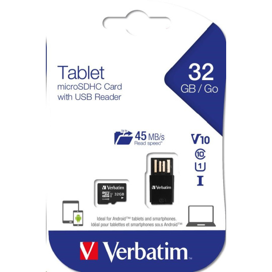 VERBATIM Tablet microSDHC C10/U1 with USB reader 32GB (R:45MB/s, W:10MB/s)