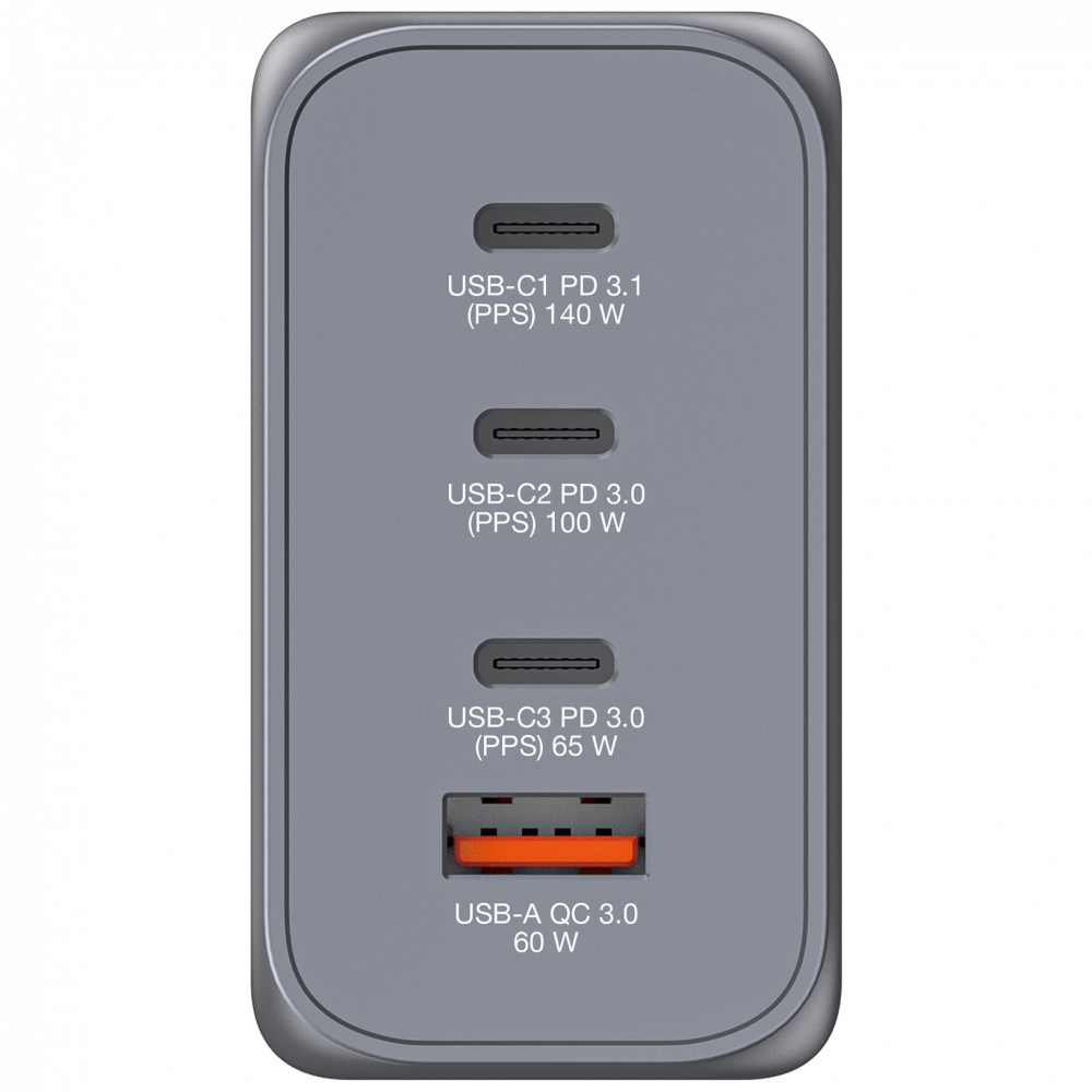 Verbatim GaN nabíječka do sítě o výkonu 240 W v elegantním designu, který se vejde do dlaně, kombinuje jeden port USB-C PD 140 W, jeden port USB-C PD 100 W, jeden port USB-C PD 65 W a jeden port USB-A QC 3.0. Ideální do kanceláře, pro domácí použití nebo na cesty, kde dodá energii vašemu notebooku, tabletu, chytrému telefonu, herním a mnoha dalším zařízením.
