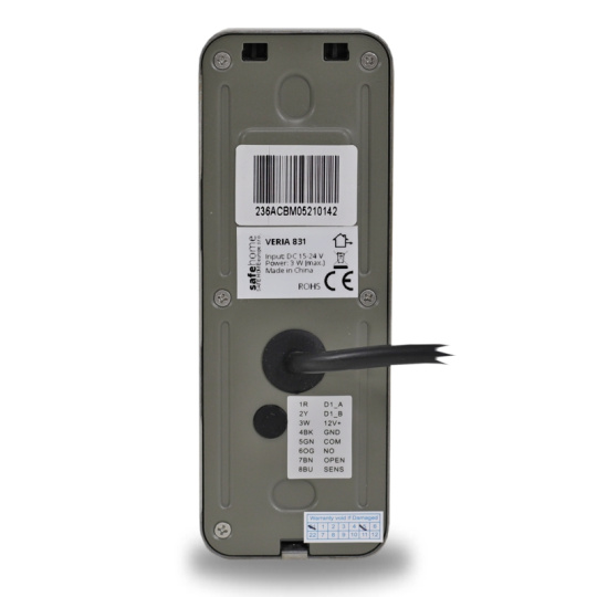 Vstupní kamerová jednotka VERIA 831 je vybavena 2 výstupními reléovými NO nebo NC (dle nastavení) výstupy. Jeden výstup ovládá dveřní elektrický zámek a druhý slouží pro ovládání zařízení bez proudové zátěže, například pojezdu elektrické brány.