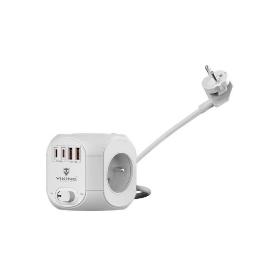 Viking AC CUBE PD30 kombinuje čtyři USB porty (2× USB-C, 2× USB-A), čtyři síťové zásuvky a 1,8m prodlužovací kabel v jednom elegantním a prostorově úsporném zařízení. Umožňuje současně napájet až osm spotřebičů nebo elektroniky, aniž by zbytečně zabíral místo na pracovním stole.