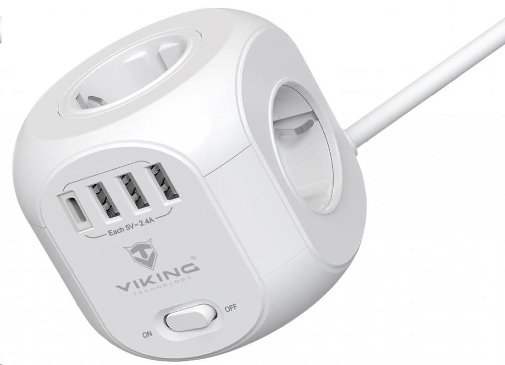 Síťový adaptér Viking AC Cube je praktickou kombinací čtyř zásuvek, čtyř USB portů a 1,8 m prodlužovacího kabelu v jednom, který šetří místo a umožňuje napájení až 8 zařízení současně.