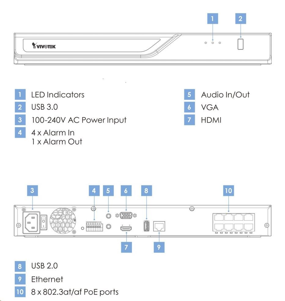 NVR podporuje technologii Smart VCA implementované v kamerách, která je založena na Deep learning (strojové učení) technologiích. Umožňuje snadno prohledávat záznamy podle jednoho nebo více typů událostí. Zařízení je vybaveno dvěma porty USB a je kompatibilní s IP kamerami třetích stran standardu ONVIF Profile S. Prostřednictvím webového rozhraní lze požádat technické oddělení výrobce VIVOTEK o pomoc formou vzdálené připojení do Vašeho NVR.