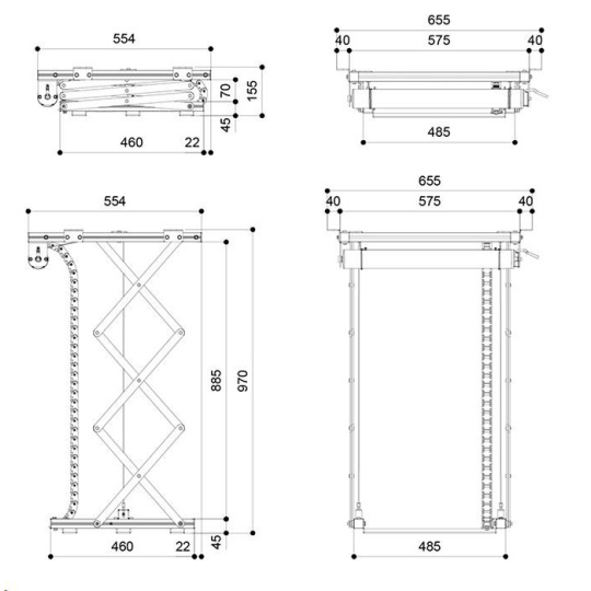- Rozměry uzavřeného výtahu 575 x 155 x 554 mm (š x v x h)
