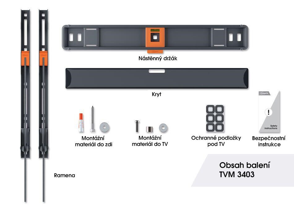 U nástěnného držáku TVM 3403 je bezpečnost na prvním místě. Držák je například vybaven bezpečnostním systémem ClickLoc™. Ten při montáži uzamkne televizor k držáku pomocí slyšitelného cvaknutí. Pro ochranu zadní strany televizoru při montáži je nástěnný držák vybaven měkkými podložkami. Držák je testován na 3x vyšší zátěž, než je jeho maximální nosnost.