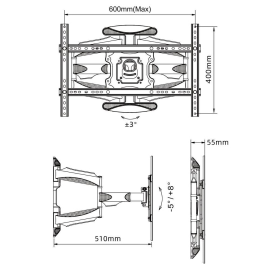 Vysouvací otočný držák na televize Ergosolid K600 Kvalitní držák na Tv 32-70", výsuvný 58-510mm, otočný +/-75°, sklopný +5°/-8°, korekce roviny +/-4°, vedení kabeláže, VESA standard 100x100 až 600x400, nosnost 45,5kg, záruka 5 let, balení obsahuje instalační materiál Nabízíme kvalitní držák na televize v krásném designu za velmi příznivou cenu. Nástěnný držák Ergosolid K600 je výsuvný, nastavíte si vzdálenost od zdi dle vlastní potřeby, televizi můžete otáčet do stran, naklápět, upravit rovinu. Je vhodný pro zavěšení všech typů a značek televizorů s úhlopříčkou 32-70", které podporují některý VESA od 100x100 až do 600x400 a jejichž hmotnost není vyšší jak 45kg. Konstrukce držáku je extrémně pevná a spolehlivá, nedochází k prověšení a ani při častém polohování nevznikají na držáku vůle, nastavení polohy je přitom vždy pohodlné a snadné. Instalace držáku na stěnu je velmi jednuduchá, zvládne ji i laik, instalační materiál je součástí balení. Ramena držáku jsou osazena designovými krytkami, které jsou určeny pro zafixování a skryté vedení kabelů. Barevné provedení černé, záruka 5 let. Vysouvací otočný držák na televize Ergosolid K600 Technické údaje: nosnost 45,5kg podpora VESA standardu 100x100 až 600x400 vhodný pro zavěšení všech typů a značek televizorů doporučená úhlopříčka televizoru 32" až 70" výsuvný - nastavení vzdálenosti od zdi v rozmezí 58-510mm otočný do stran +/- 75° nastavení sklonu Tv +5° až -8° korekce roviny obrazovky +/- 4° extrémně pevná a spolehlivá konstrukce nevznikají vůle ani prověšení i při maximálním zatížení designové krytky ramen držáku pro skryté vedení kabeláže designové kryty nástěnného závěsu pohodlné polohování televize snadná instalace instalační materiál součástí balení barevné provedení černé záruka 5 let Držák s VESA 100x100 až 200x200 a přídavným VESA nástavcem 200x200 až 600x400 na držáku Tv Ergosolid K600 Výsuvný držák Tv Ergosolid K600 podporuje VESA standardy pro zavěšení Tv: VESA 100x100 (bez použití VESA nástavce) VESA 200x100 a 100x200 (bez použití VESA nástavce) VESA 200x200 (bez použití VESA nástavce) VESA 300x200 a 200x300 VESA 300x300 VESA 400x200 a 200x400 VESA 400x300 a 300x400 VESA 400x400 VESA 600x400 Na nástěnný držák Ergosolid K600 můžete zavěsit všechy typy a značky televizorů, jejichž hmotnost nepřesahuje 45kg a které podporují některý z výše uvedených VESA standardů. Velikost televizoru není podstatná, uvedené úhlopříčky jsou pouze informativní..