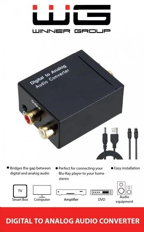 Praktický konvertor, který umožní připojit zařízení s digitálním audio výstupem (optický Toslink nebo koaxiální) k analogovým zesilovačům nebo reproduktorům s RCA vstupy. Ideální řešení pro propojení moderní techniky se starším audio vybavením.