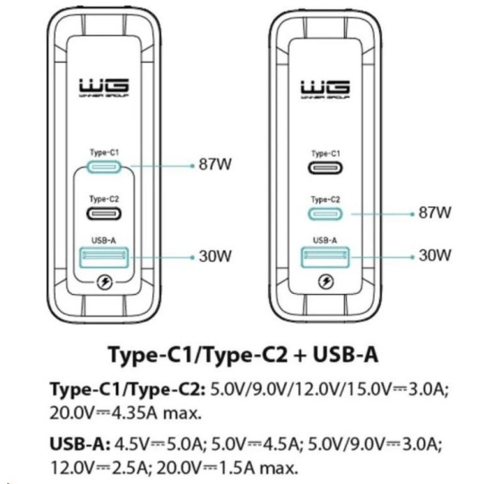 - USB-C1/C2 +USB-A: 5V/9V/12V/15V?3A, 20V?4.35A max (87W+30W)
