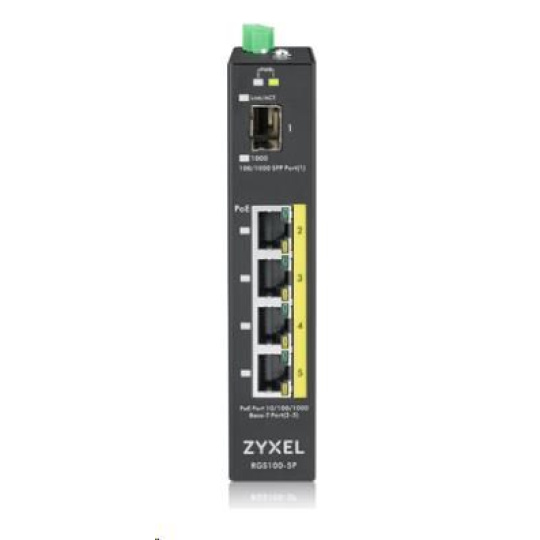 Zyxel RGS100-5P 5-port Gigabit PoE switch, 4x GbE + 1x SFP, PoE budget 120W, DIN rail/Wall mount, IP30